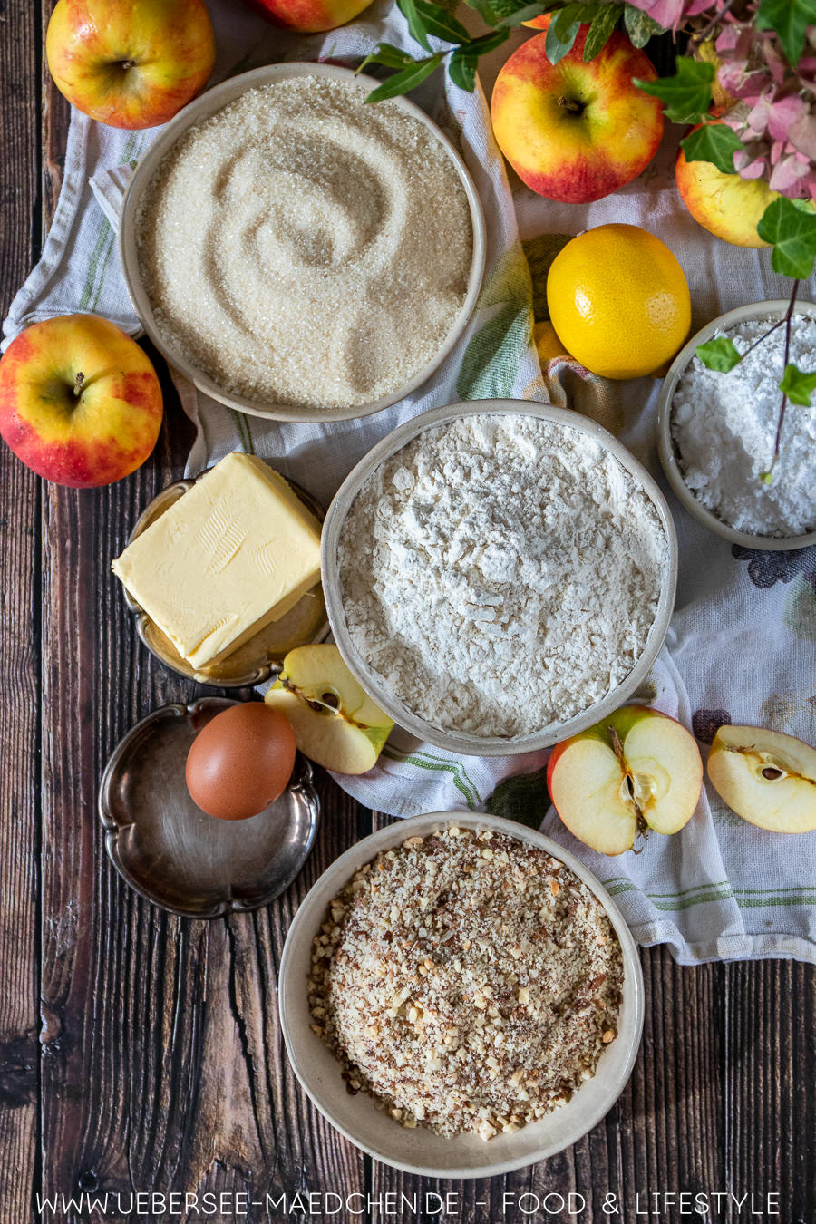 1,25 Kilogramm Äpfel (das entspricht etwa sechs Äpfeln), 325g Mehl, 250g Zucker, 150g kalte Butter, 125g gemahlene Mandeln, ein Ei, 2 TL Vanilleextrakt, eine Prise Salz. Für den Zuckerguss außerdem 125g Puderzucker, 3 EL Zitronensaft und bei Belieben 25g Mandelblättchen.