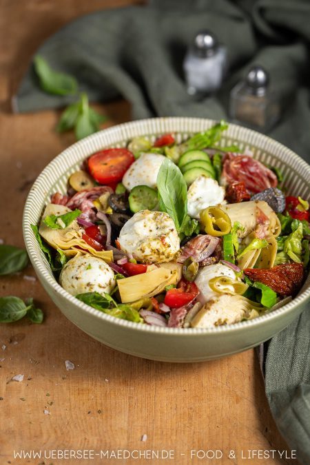 Italienischer Salat ist ein köstlicher Sattmacher, den ich mir zuletzt mindestens einmal die Woche zubereitet habe. Es ist einfach so praktisch, weil ich die meisten Zutaten meistens ohnehin im Kühlschrank oder Vorrat habe. Und es ist eine leckere Idee, um angebrochene Antipasti aufzubrauchen.