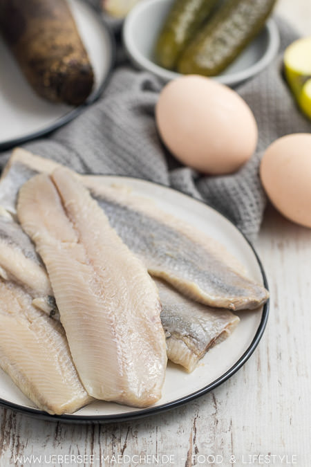 300g rote Bete, 250g Matjes, 200g saure Sahne, zwei Eier, zwei Gewürzgurken, ein Apfel, eine Schalotte, 1 EL Creme fraiche, 1 EL Essig und 1/2 EL Öl. Zum Würzen außerdem Salz, Pfeffer, Kümmel und eine Prise Zucker.