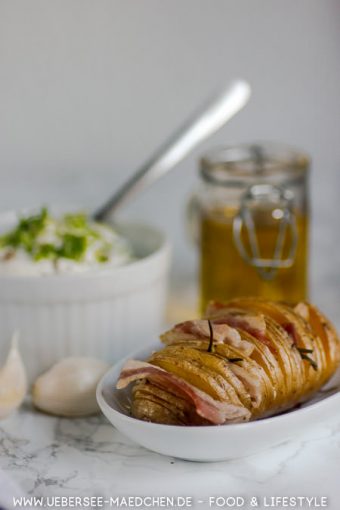 Die Hasselback-Kartoffeln kommen jetzt für etwa eine Stunde in den Ofen, bis sie gar und schön knusprig sind. Dazu passt mein heißgeliebter Frühlingsquark, dieses Mal mit Schnittlauch. Et voilá, lasst es euch schmecken!